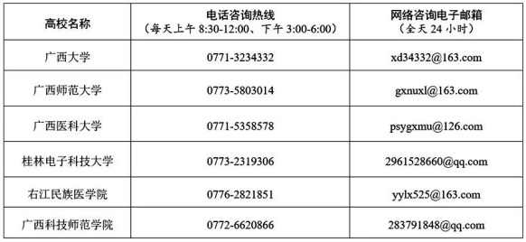 根據(jù)自治區(qū)黨委教育工委、自治區(qū)教育廳將組織區(qū)內有關高校心理健康教育與咨詢中心的專家教授組成專業(yè)的心理支持團隊,在疫情防控期間為廣西社會大眾和廣大師生免費提供心理援助電話咨詢和網(wǎng)絡輔導服務。疫情防控期間每天上午8:30-12:00、下午3:00-6:00可直接撥打心理援助咨詢熱線進行電話咨詢,疫情防控期間可全天候發(fā)送電子郵件進行咨詢。
