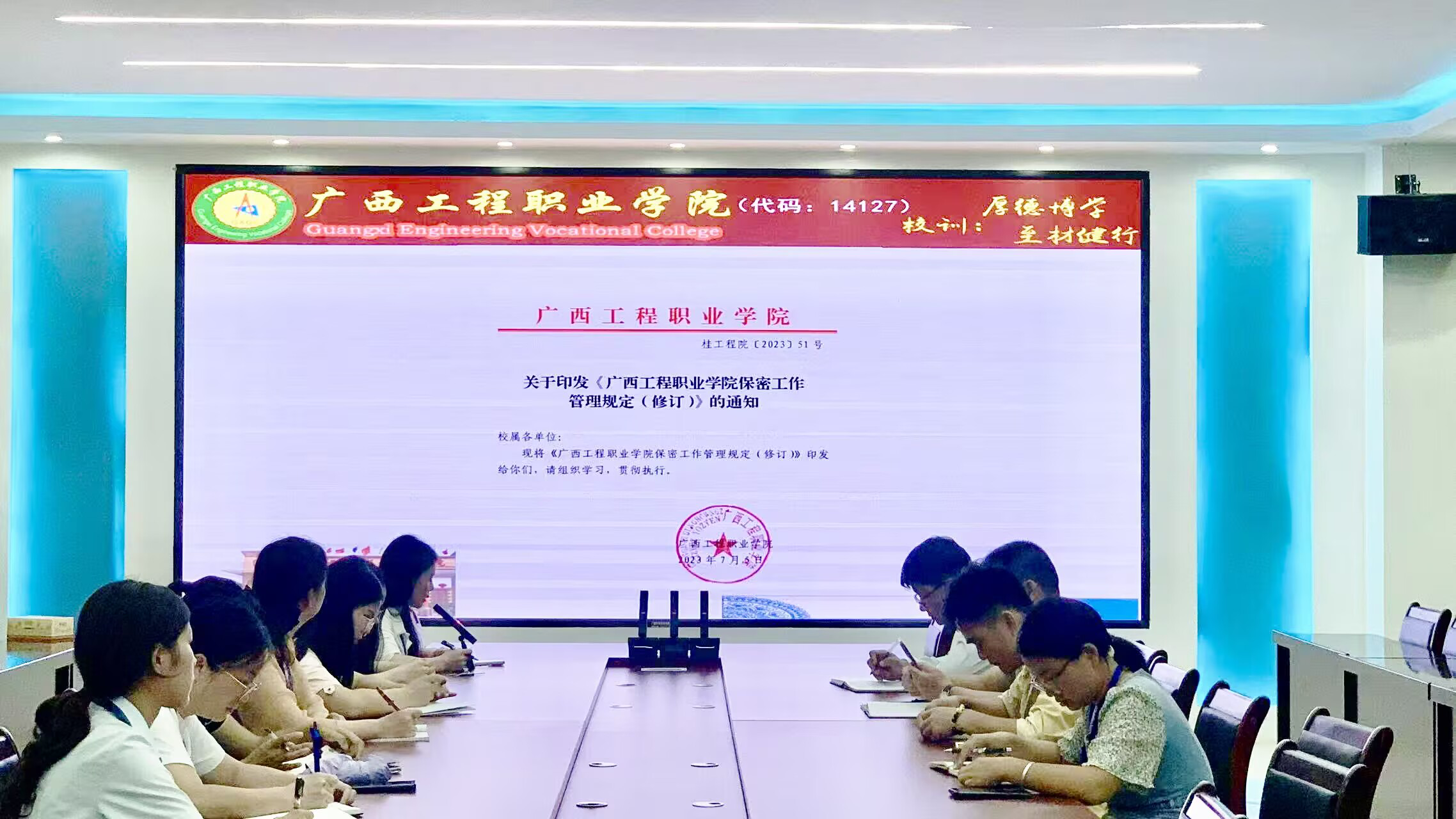 隨后,與會(huì)人員集體學(xué)習(xí)了《廣西工程職業(yè)學(xué)院保密工作管理規(guī)定(修訂)的通知》及相關(guān)文件精神。通過專題培訓(xùn)解讀,進(jìn)一步強(qiáng)化了教師的保密責(zé)任和底線思維,明確了行為規(guī)范,提升了防范能力。同時(shí),在學(xué)習(xí)過程中,與會(huì)人員紛紛表示,要認(rèn)真學(xué)習(xí)貫徹習(xí)近平總書記關(guān)于保密工作的一系列重要指示精神,將保密教育融入日常工作和生活中,加強(qiáng)保密意識(shí),樹牢底線思維,以實(shí)際行動(dòng)確保黨和國家秘密絕對(duì)安全。同時(shí),各部門將嚴(yán)格按照學(xué)校要求,加強(qiáng)涉密文件管理,規(guī)范使用手機(jī)、電腦及各類電子設(shè)備,嚴(yán)禁利用互聯(lián)網(wǎng)和微信軟件傳遞涉密文件,確保國家秘密安全。
