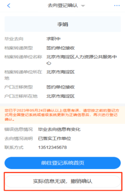 如果畢業(yè)生提交確認(rèn)信息有誤后發(fā)現(xiàn)實際信息無誤,可返回“去向登記確認(rèn)”界面,點擊“實際信息無誤,撤銷確認(rèn)”,撤銷后重新選擇“信息無誤,確認(rèn)登記去向”提交。