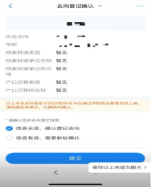 如果信息無誤,點擊“信息無誤,確認(rèn)登記去向”提交。畢業(yè)生檔案信息以畢業(yè)生提供給學(xué)院的郵寄檔案信息為準(zhǔn)。戶口未遷入學(xué)校的同學(xué)其信息不變,戶口遷入學(xué)校的同學(xué),按學(xué)校戶籍部門要求辦理遷出手續(xù)。