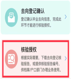 選擇進(jìn)入“核驗授權(quán)”模塊(畢業(yè)生需要完成去向登記確認(rèn)才能進(jìn)行核驗授權(quán))。