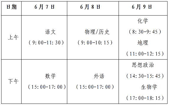 (二)考試時間。全國統(tǒng)考科目由教育部命題,按教育部規(guī)定時間組織考試。選擇性考試科目由我區(qū)自主命題,每門考試時長均為75分鐘,與全國統(tǒng)考科目的考試同期安排,如全國統(tǒng)考科目有調(diào)整,選擇性考試科目的考試安排相應(yīng)調(diào)整。具體考試時間安排如下: